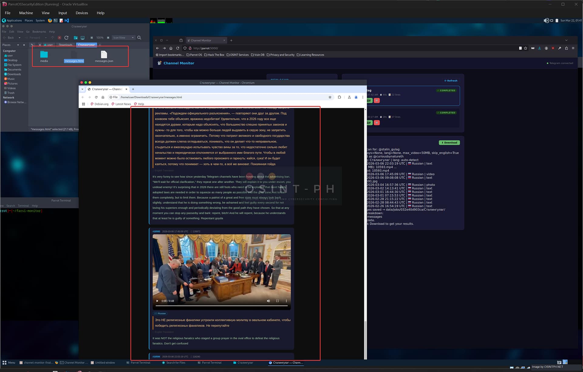messages.html — a self-contained report that opens directly in any browser. Original text in amber, right-to-left aligned where appropriate for Arabic and Farsi. English translation in green below. Photos rendered inline. Videos with an embedded player. Language badge on every message. No server required, you can attach it directly to a report or share it as-is.