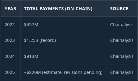 Ransomware revenue was roughly $820 million in on-chain payments last year, according to Chainalysis. Down from the $1.25 billion record in 2023, but still one of the more reliable criminal revenue streams on the planet.