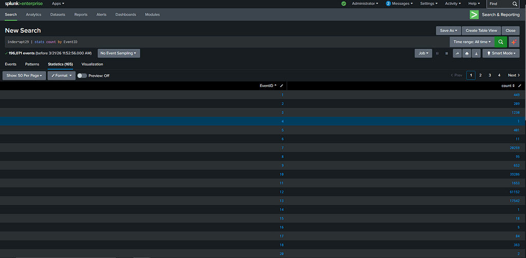 No filters. Just give me a breakdown of every EventID in the dataset and how many times each one appears. This took 165 seconds to run across the full 196,071 events and what came back was the most informative thing I saw all day.