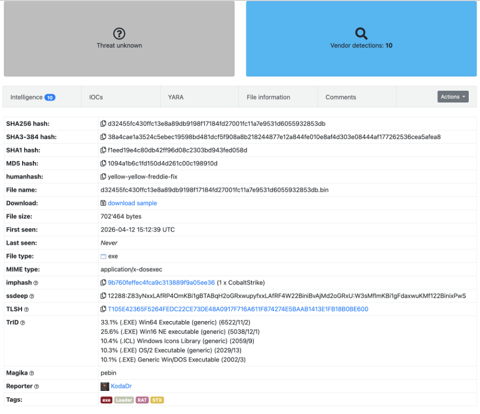 At this point we have traced a fair bit of the full execution chain from the initial DLL through three layers of XXTEA + zlib nesting to the core STX RAT payload. We managed to uncover the reflective PE loader, API hashing techniques, encrypted configuration parsing, C2 communication sequence, anti-analysis checks and the command dispatch mechanism with its various execution capabilities.